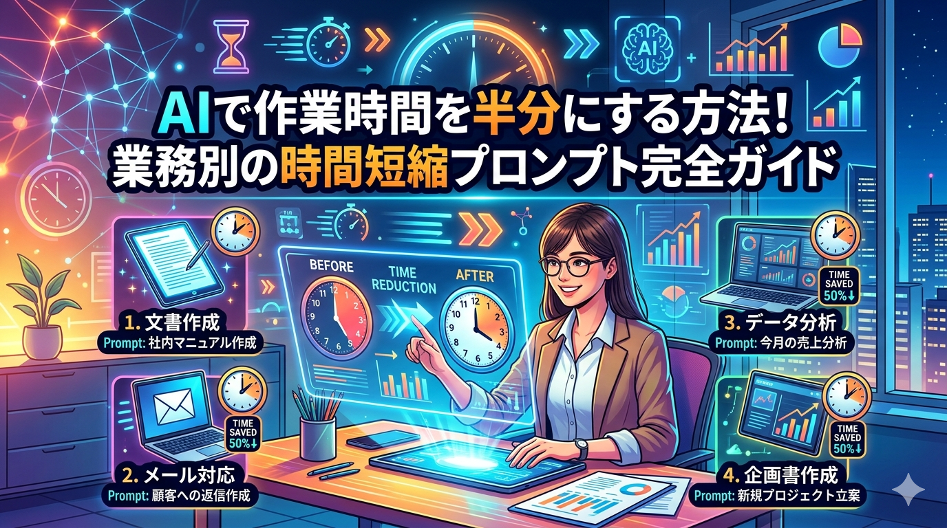 そんな悩みを持っていませんか?AIで作業時間を短縮するカギは、プロンプトの書き方にあります。正しいプロンプトを使えば、メール・議事録・資料作成・データ整理・文章校正など、どの業務でも作業時間を半分以下に削減できます。