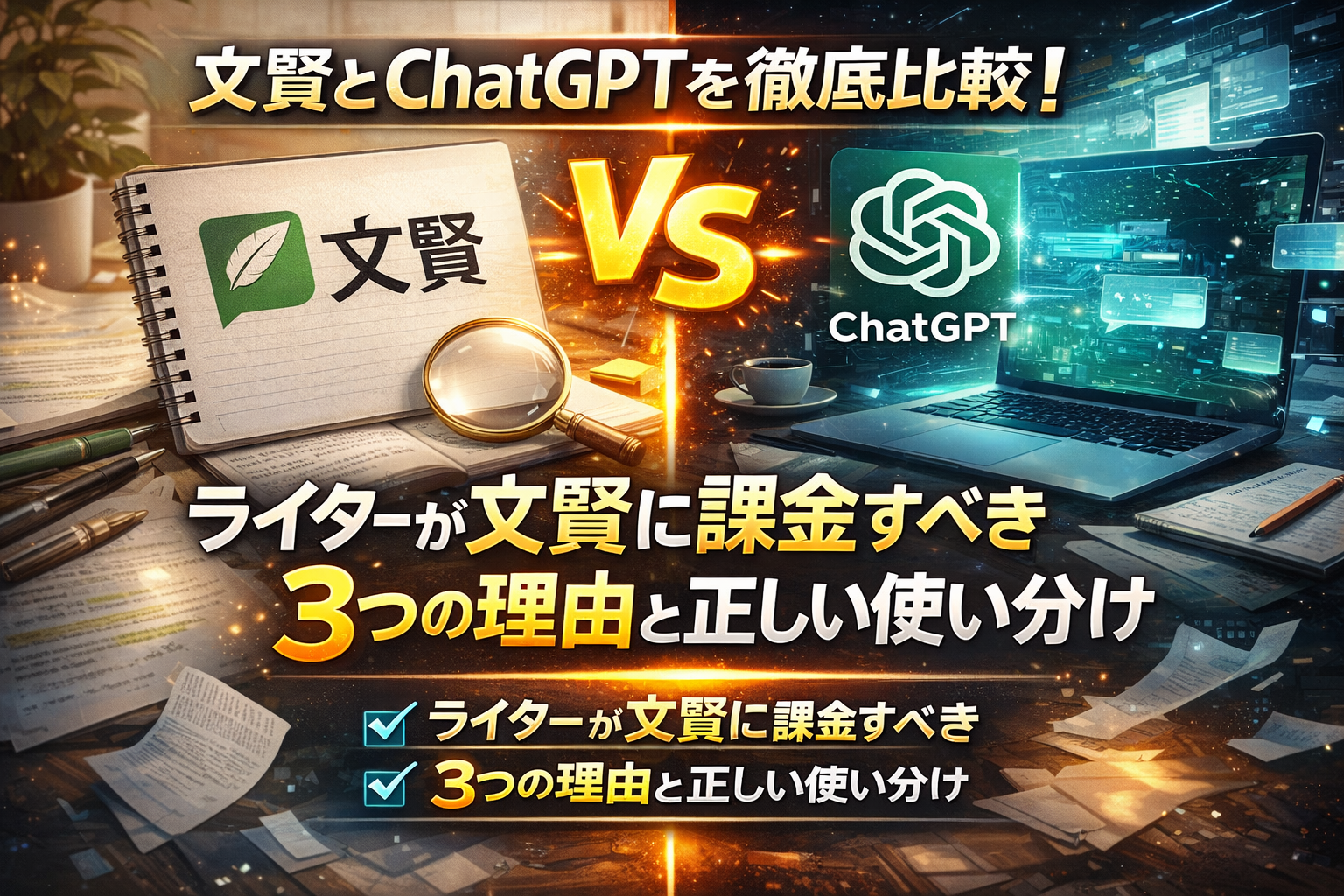 この記事では、文賢とChatGPTの違いを機能・料金・得意分野の3つの視点で正直に比較し、ライターや文章を書く仕事をしている方が文賢に課金すべき理由をわかりやすく解説します。「どちらを使うべきか迷っている」という方はぜひ最後まで読んでみてください。